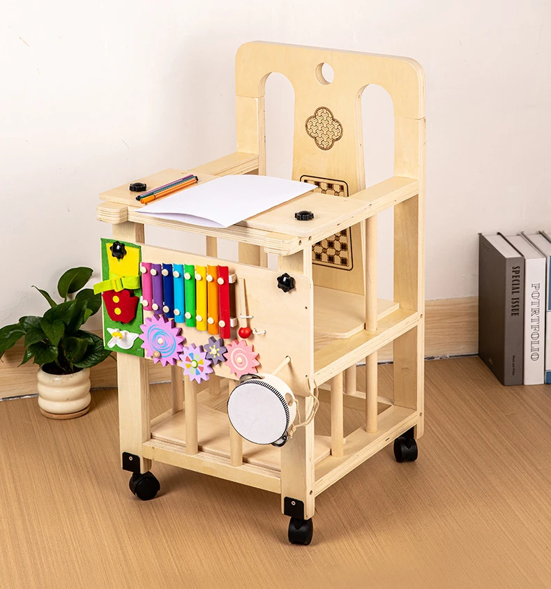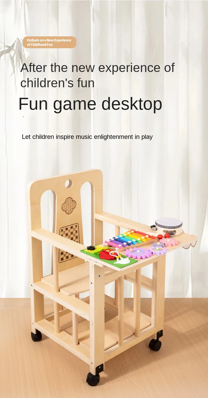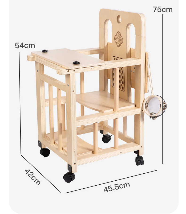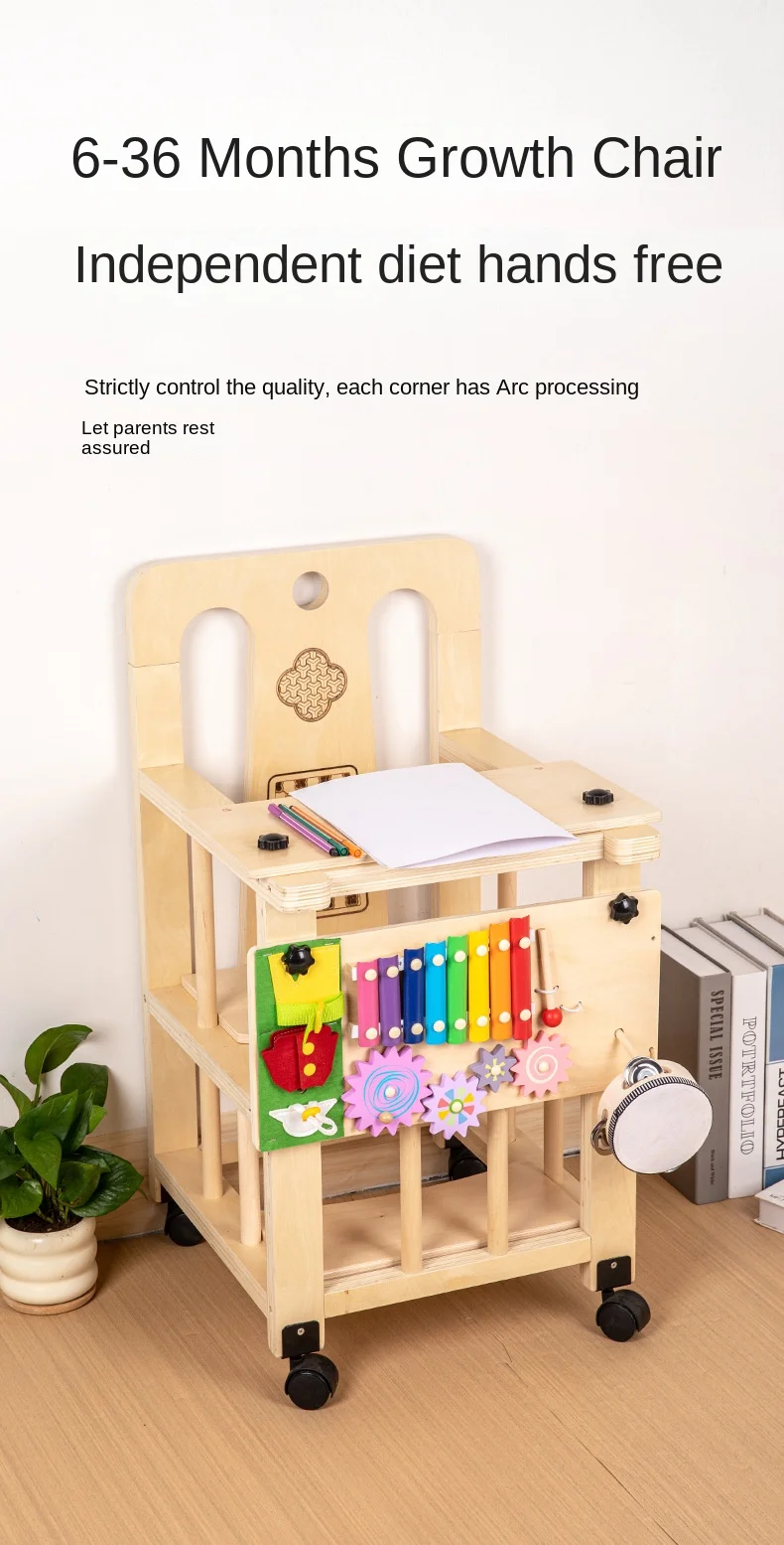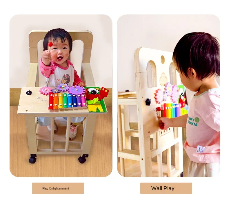 Multifunktions-Wachstumsstuhl für Kinder Montessori-Frühförderung Interaktives Holzspielzeug mit Klopf-Xylophon, Zahnrädern, Knöpfen und Trommel