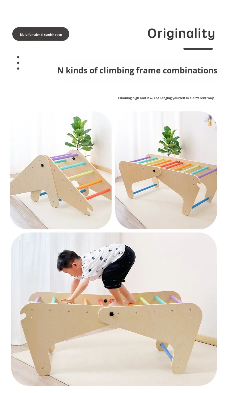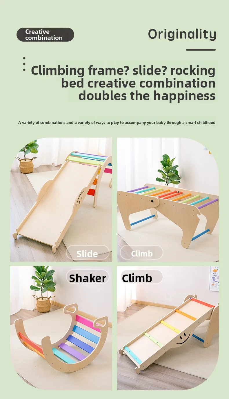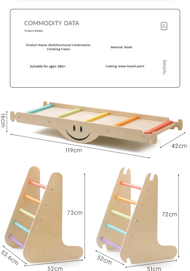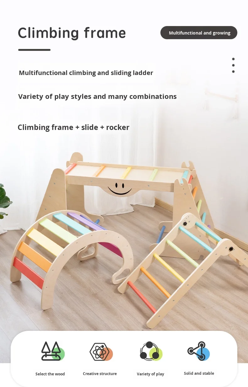 Pielāgojams iekštelpu cieto rotaļlietu komplekts mazbērniem, Montesori bērnu kāpšanas struktūra ar koka kāpšanas rāmi un slīdētavu bērniem.