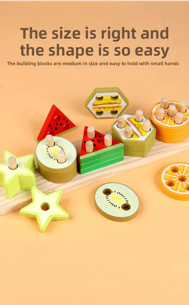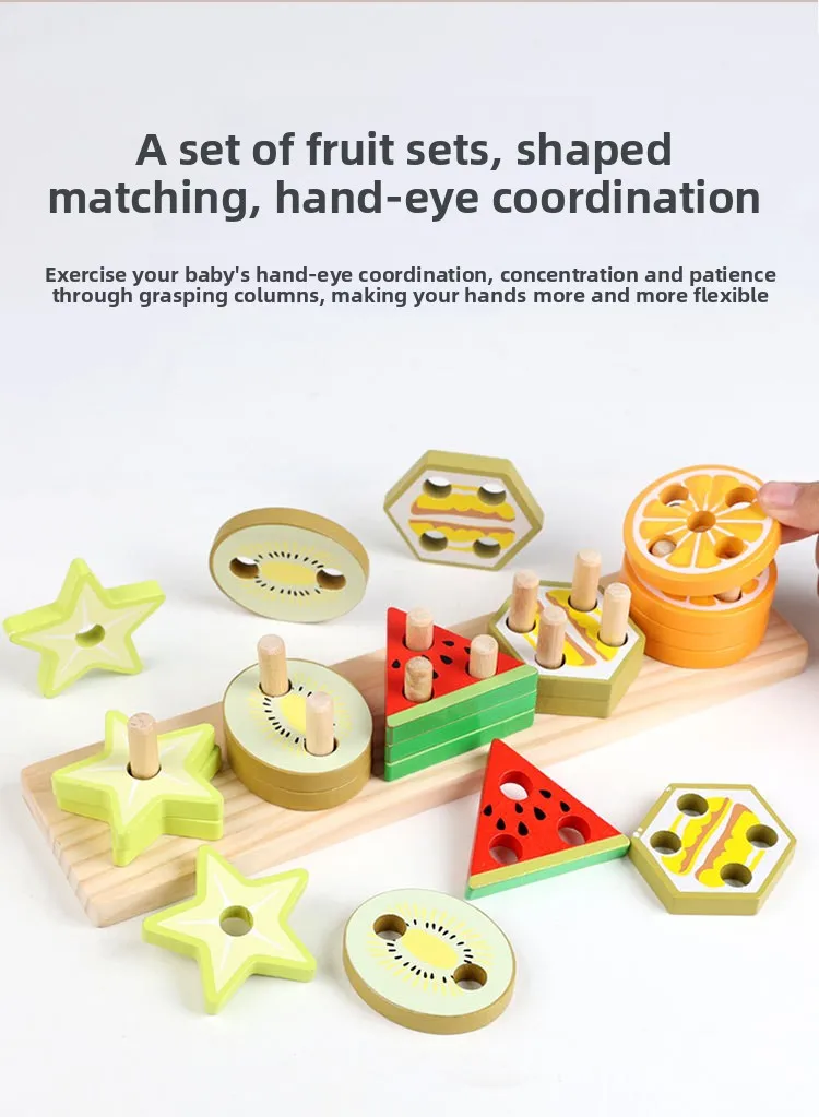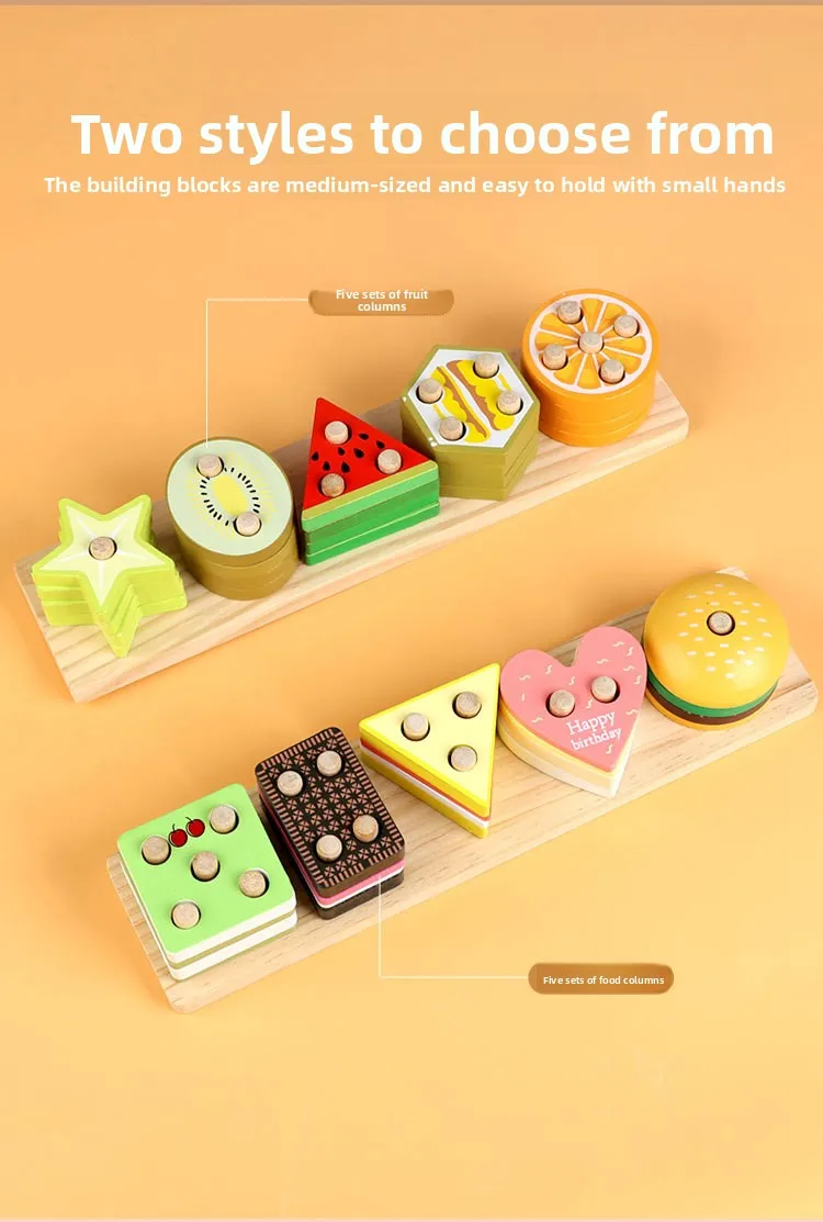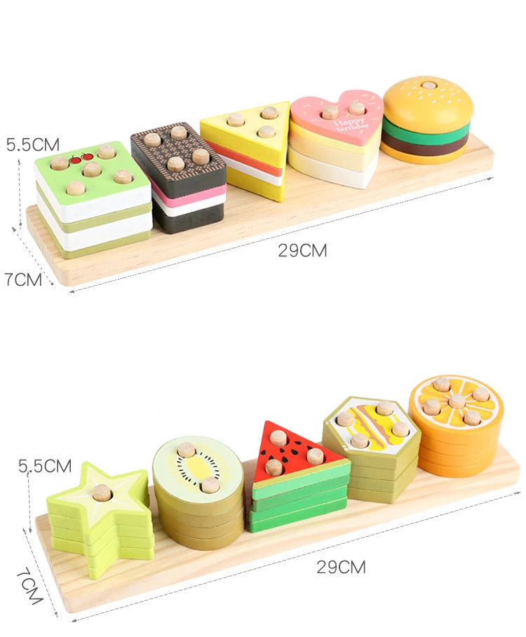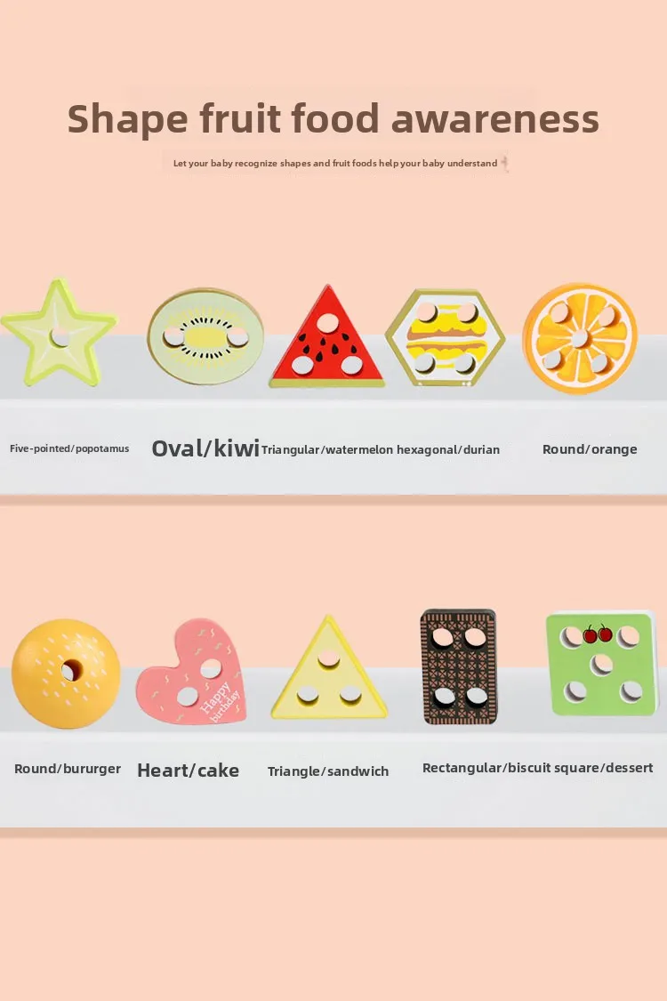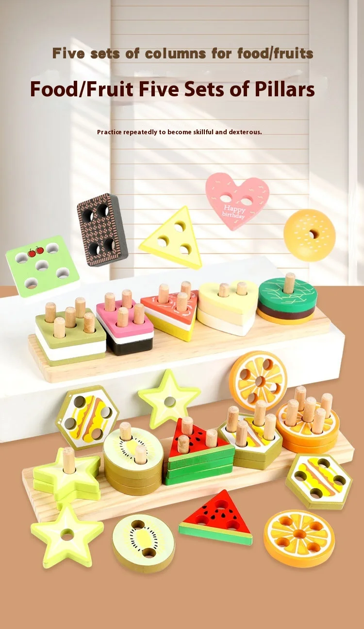 Houten geometrische vorm voedsel/fruit vijf sets kolommen vroeg educatieve puzzels Montessori houten sorteer- en stapelspeelgoed