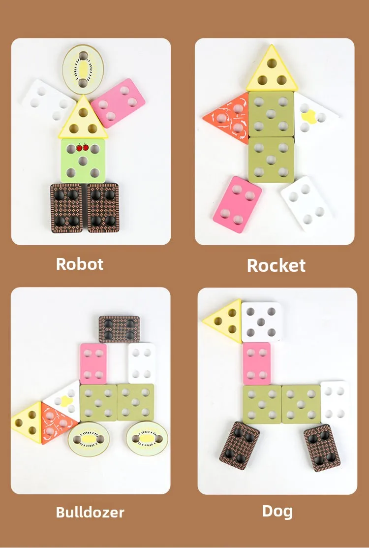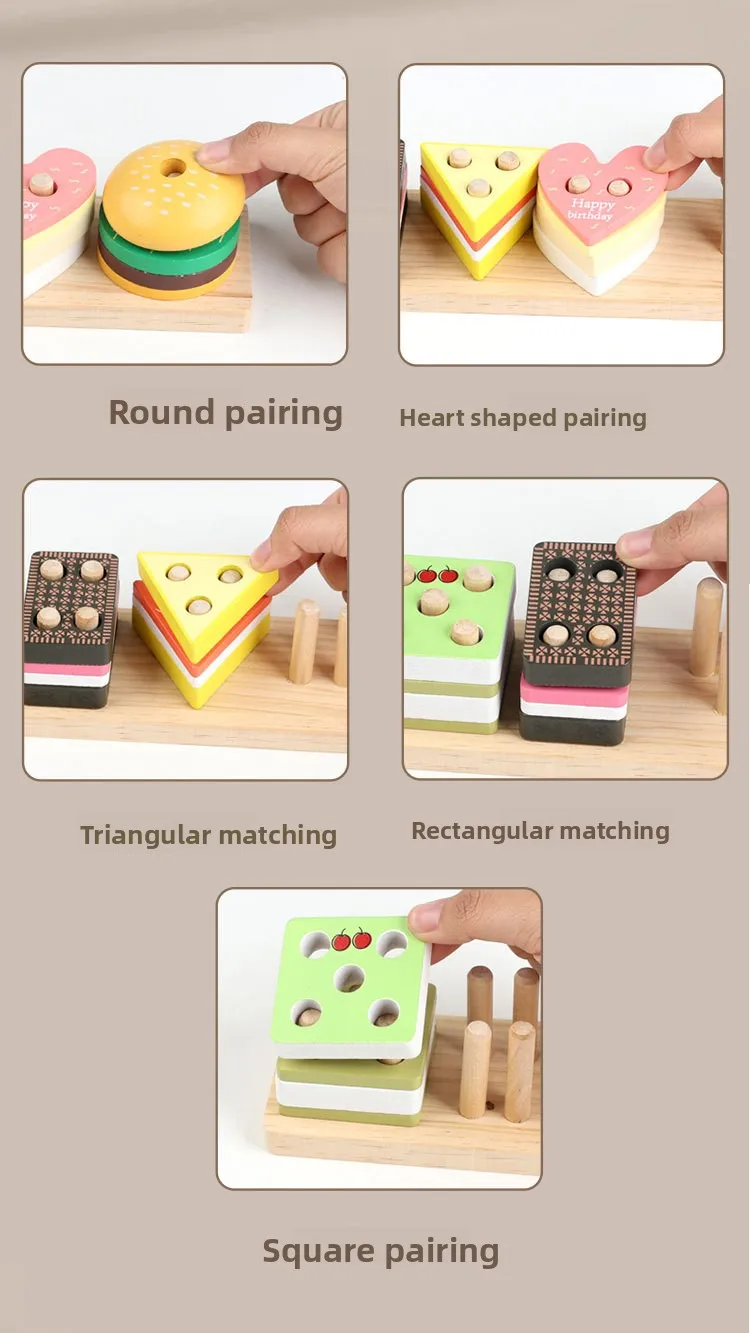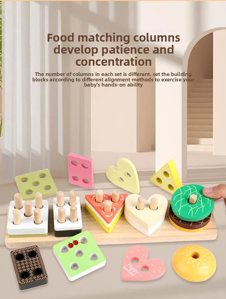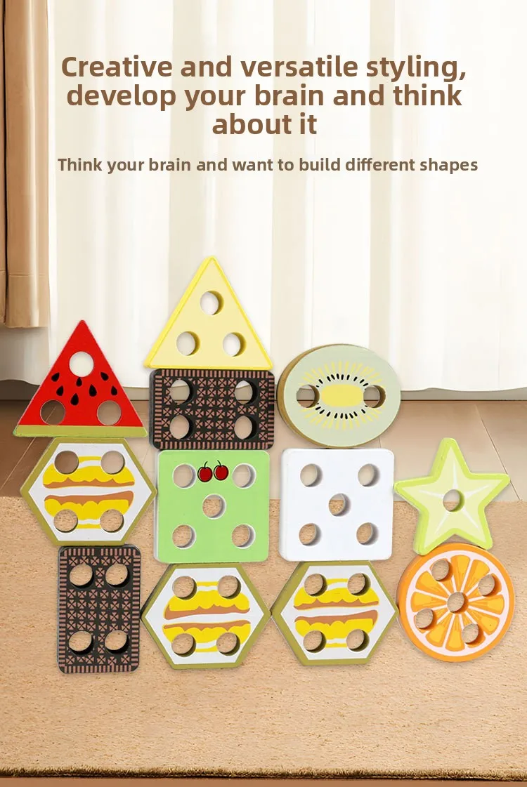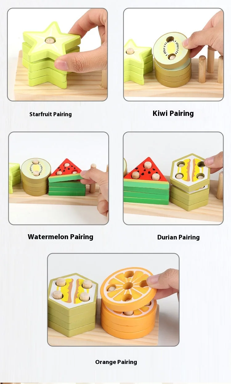 Houten geometrische vorm voedsel/fruit vijf sets kolommen vroeg educatieve puzzels Montessori houten sorteer- en stapelspeelgoed