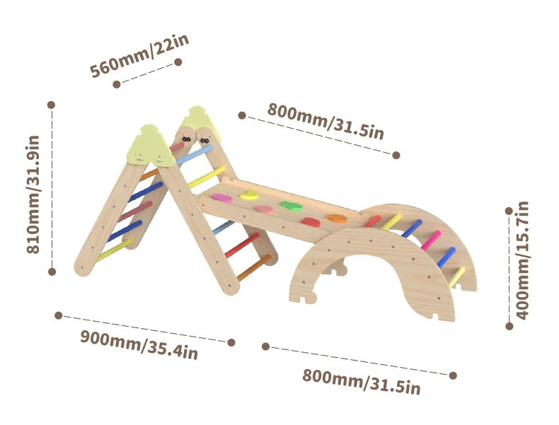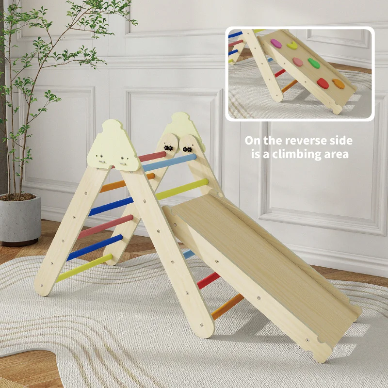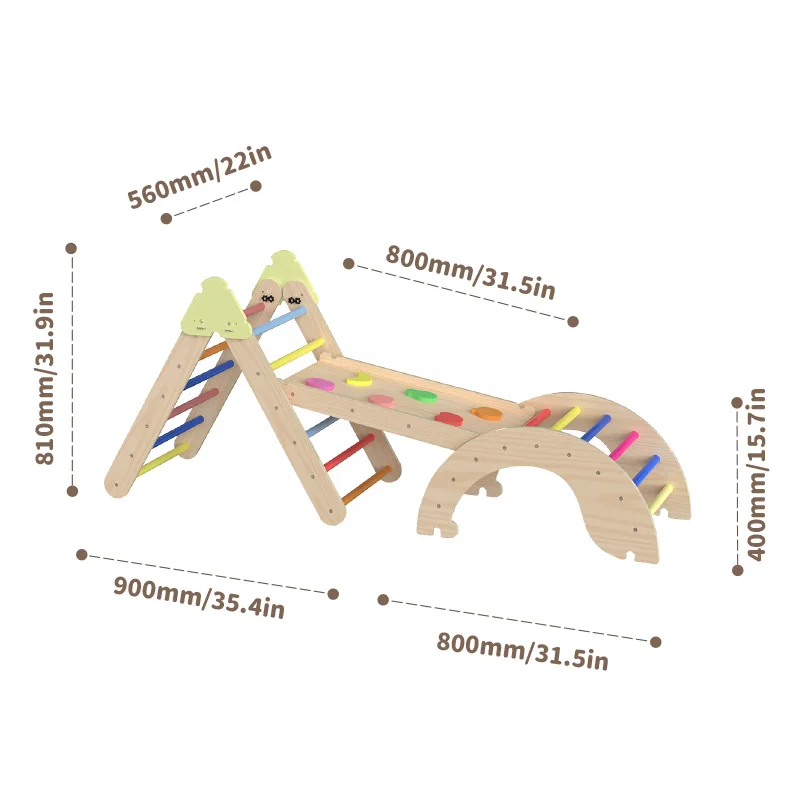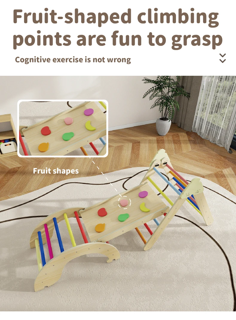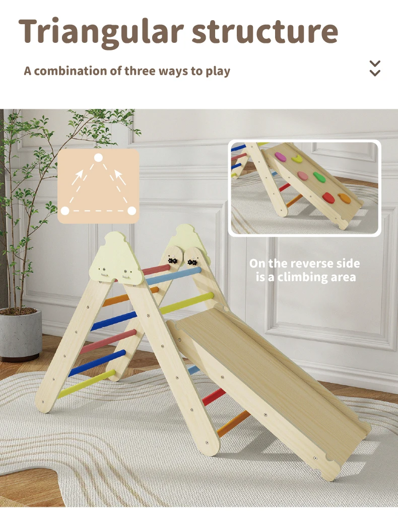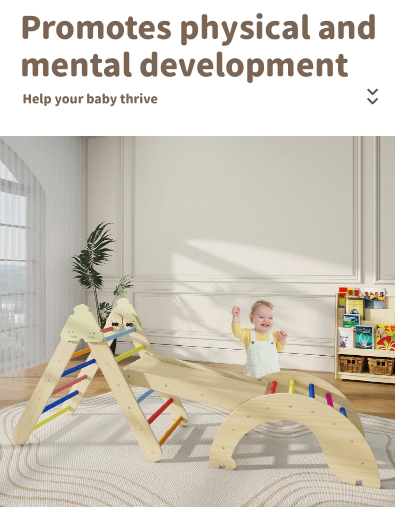 Drewniany zestaw do wspinaczki Montessori w kształcie trójkąta z łukiem i pochylnią dla małych dzieci – wewnętrzna strefa aktywności i zabaw, plac zabaw typu jungle gym