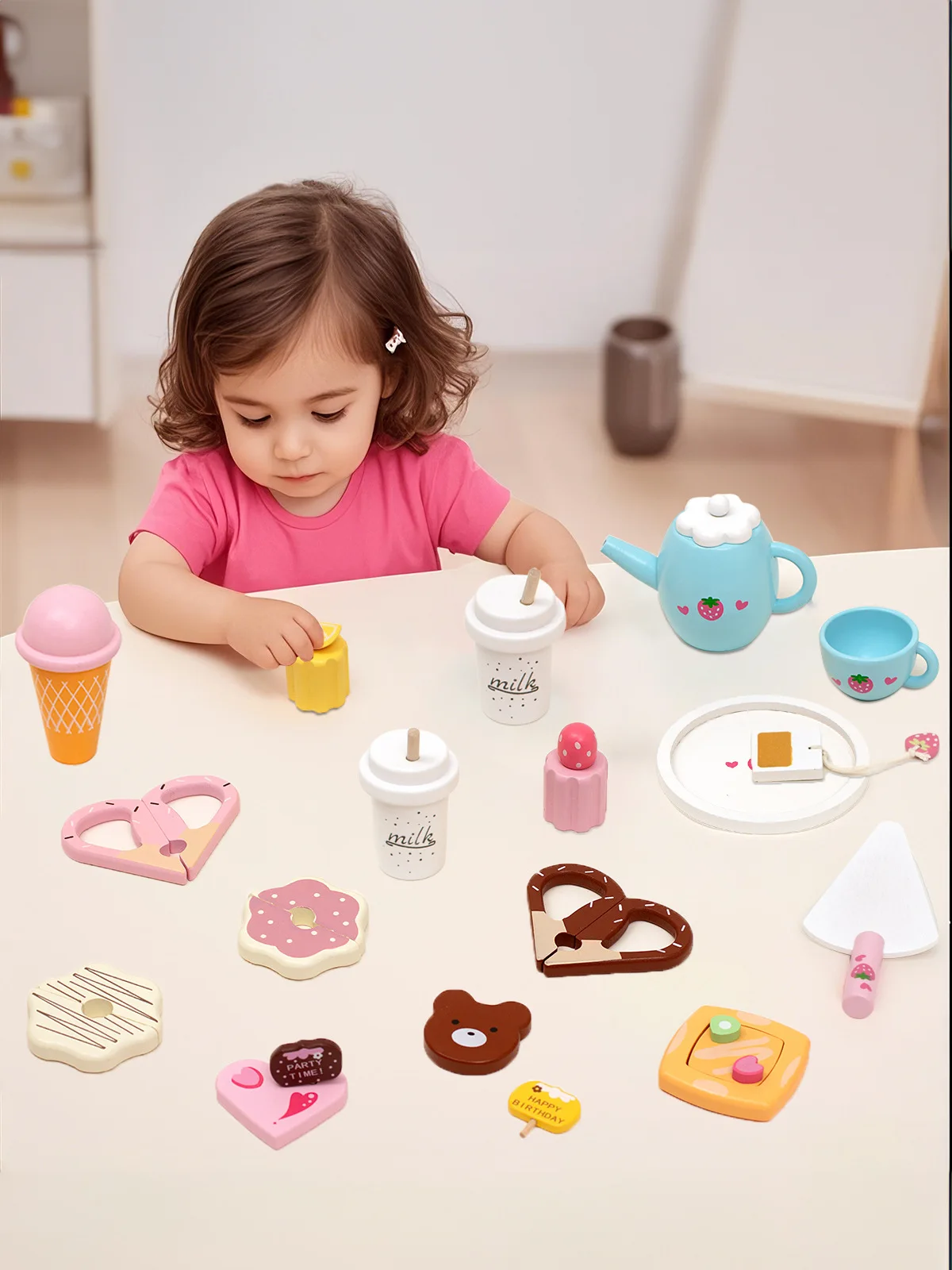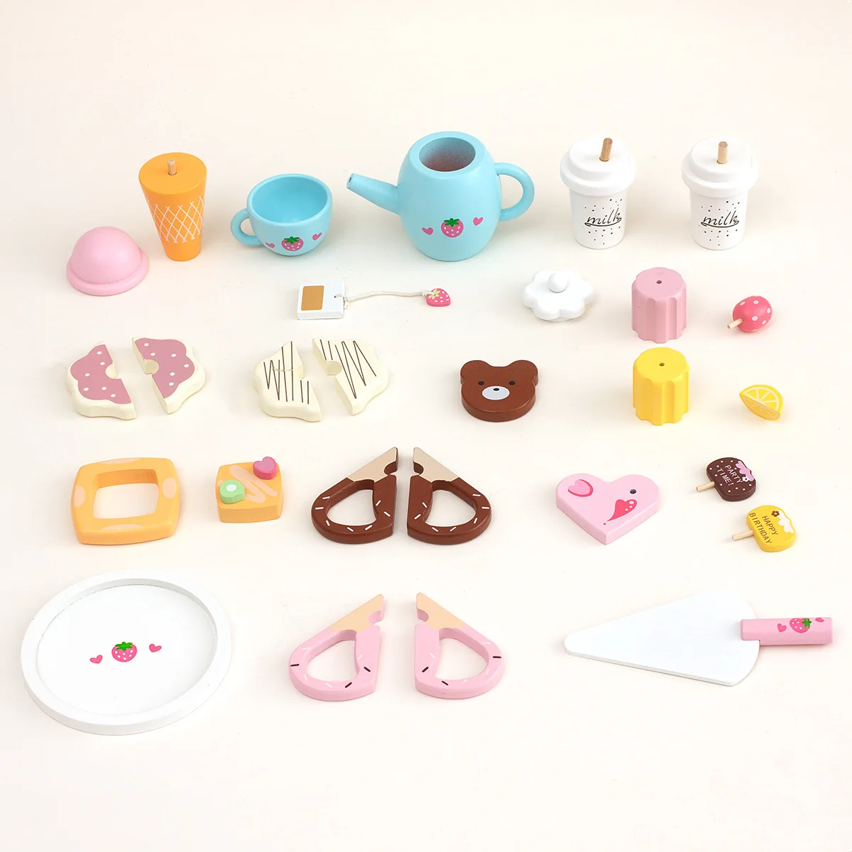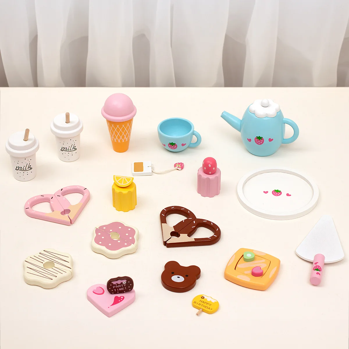 New Design Children's Simulation Wooden Afternoon Tea Dessert Cake Set Educational Pretend Toys for Boys Girls Gift