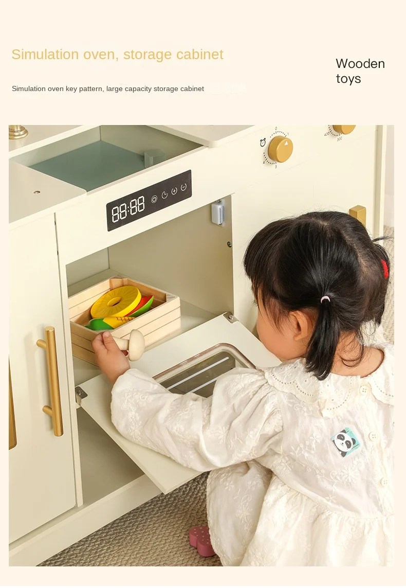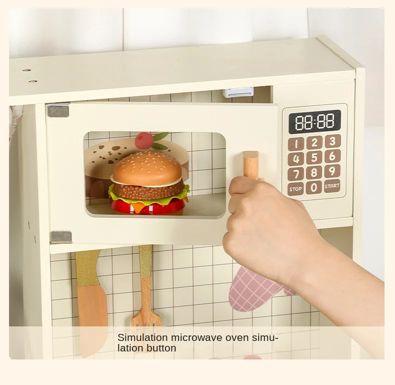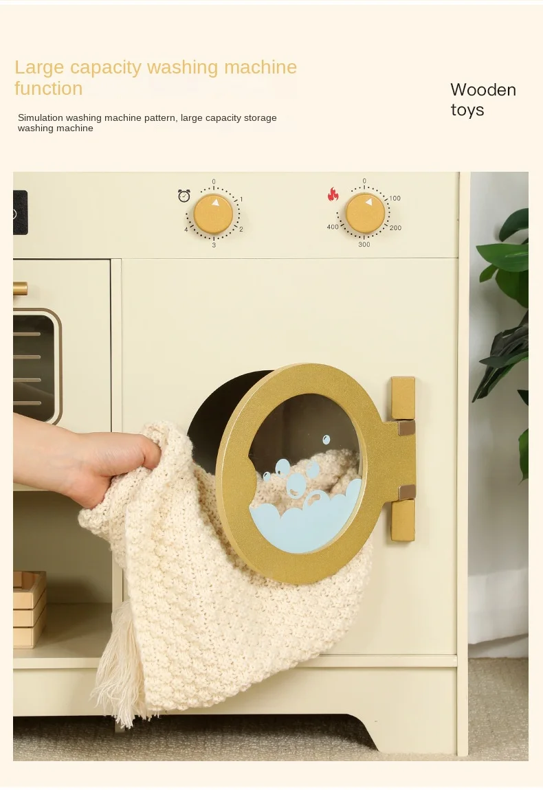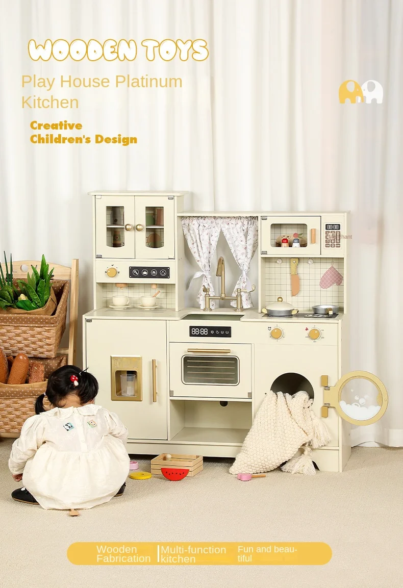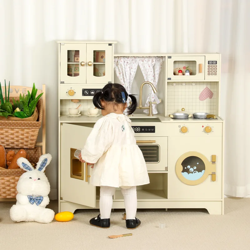 Multi-Functional Wooden Kitchen Simulator Toy for Children Platinum Oven Microwave and Washing Machine for Girls' Pretend Play
