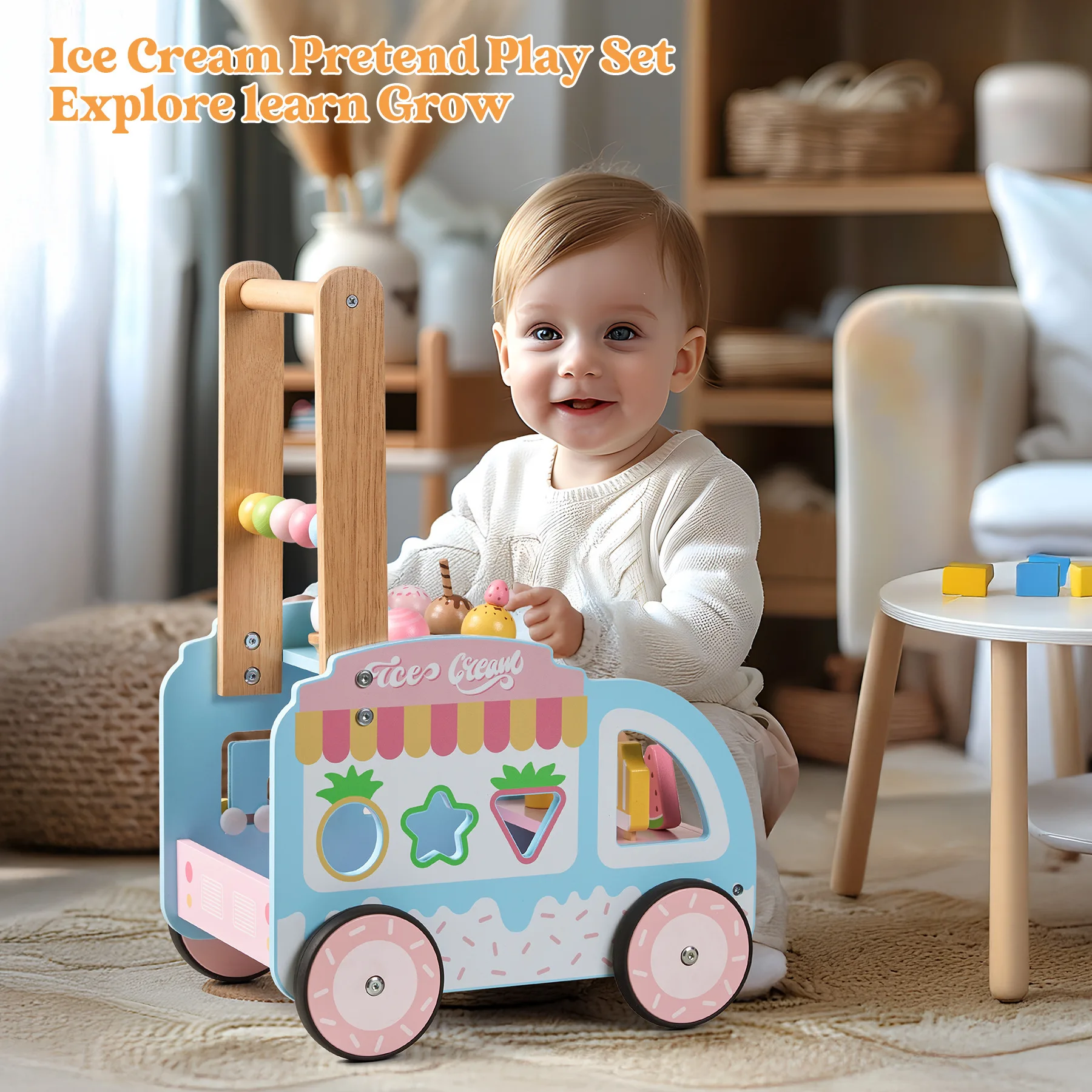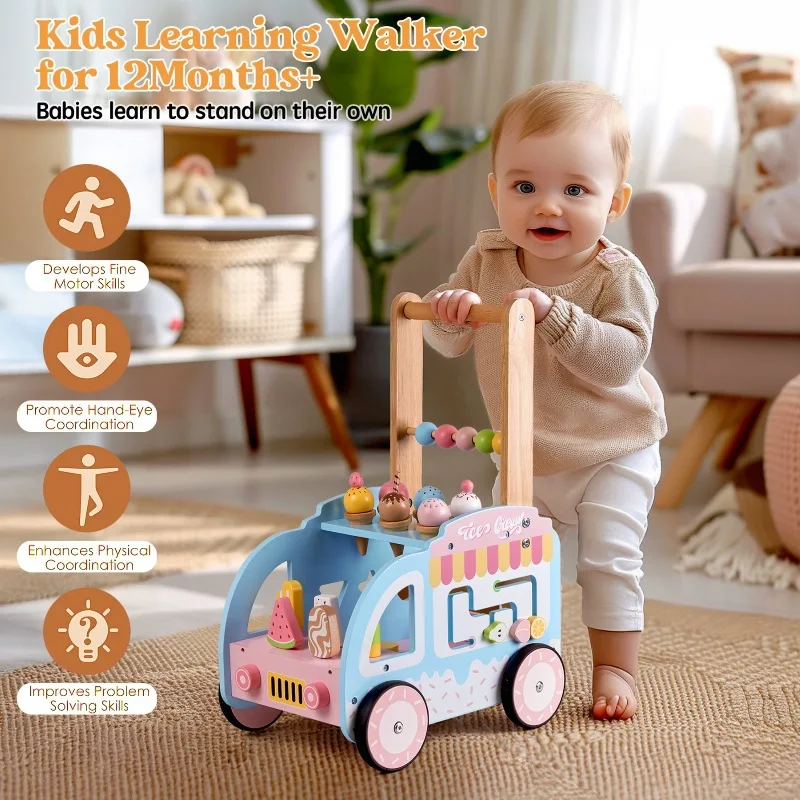 Wooden Baby Walker Hands-on Ability Exercise Early Education Toy Multifunctional Ice Cream Cart Activity Preschool Learning Toys