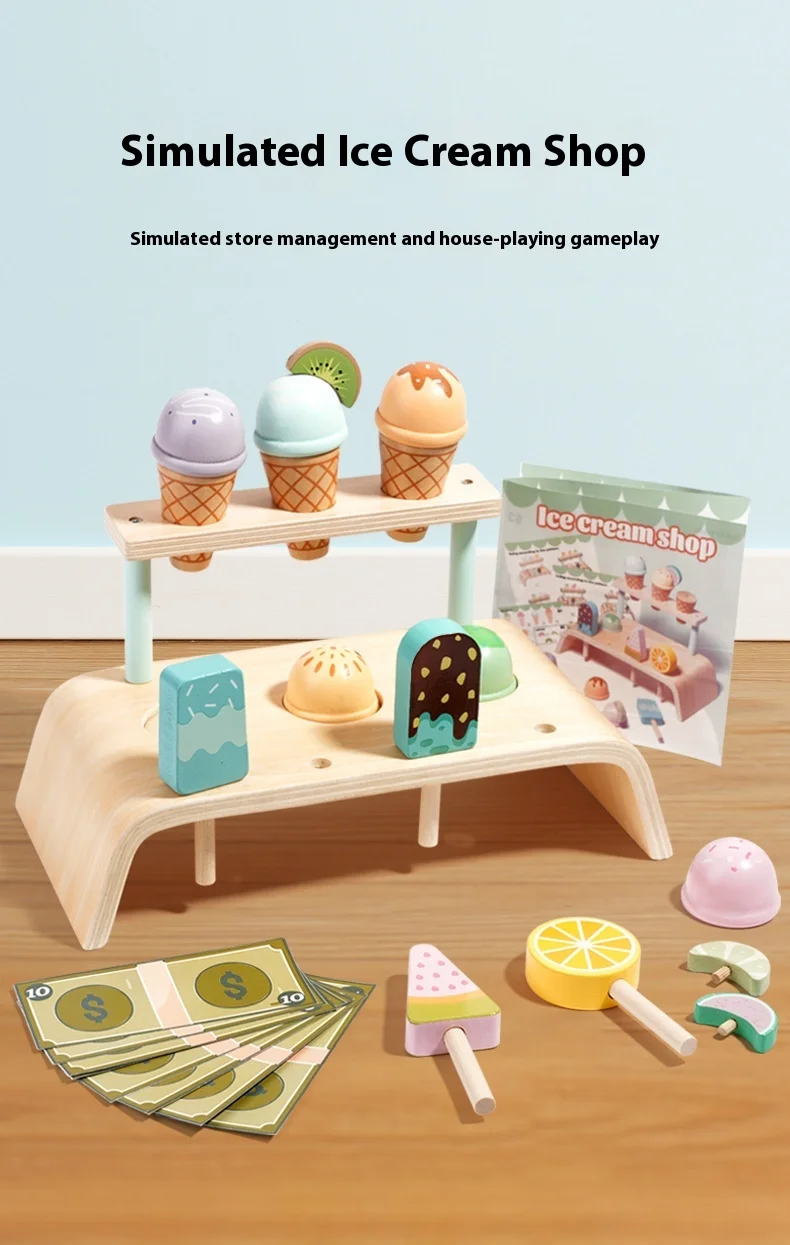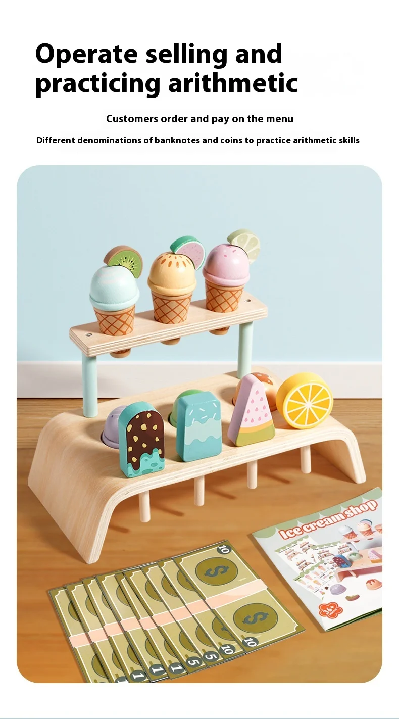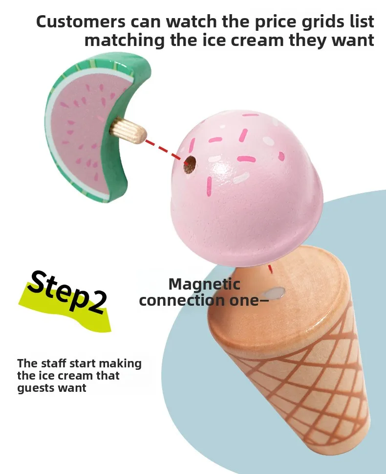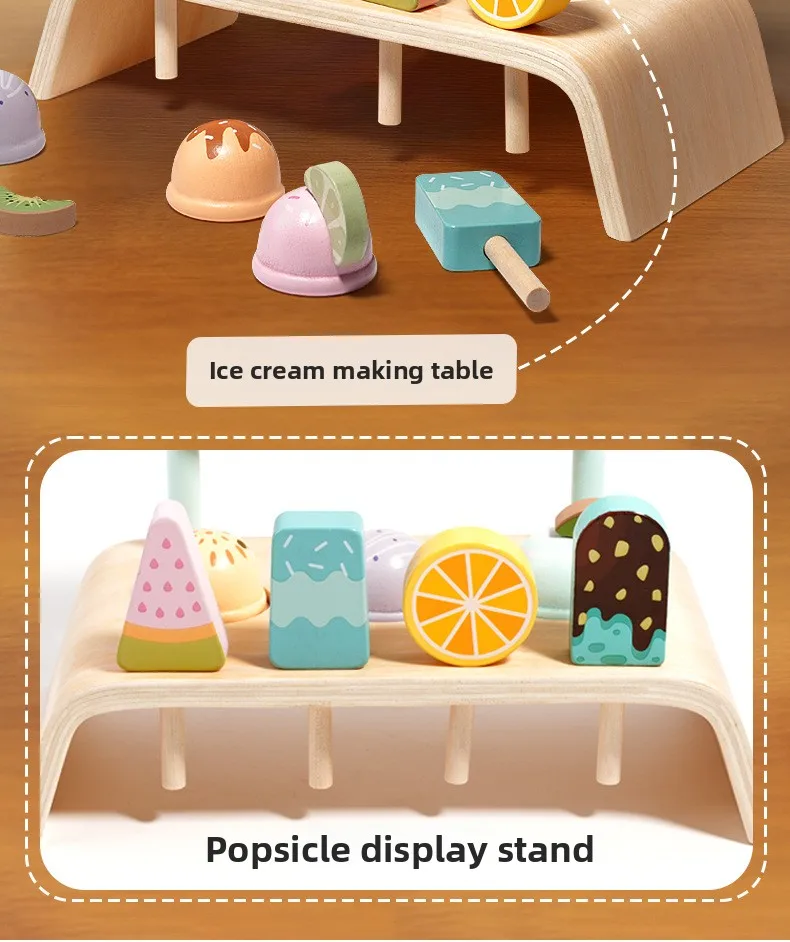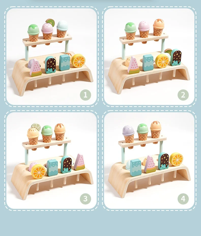 Skräddarsydda Montessori-leksaker i trä, leksaksgrannisglass på pinne, efterapningsspel med mat, kökstillbehör, trästånd för glass för barn