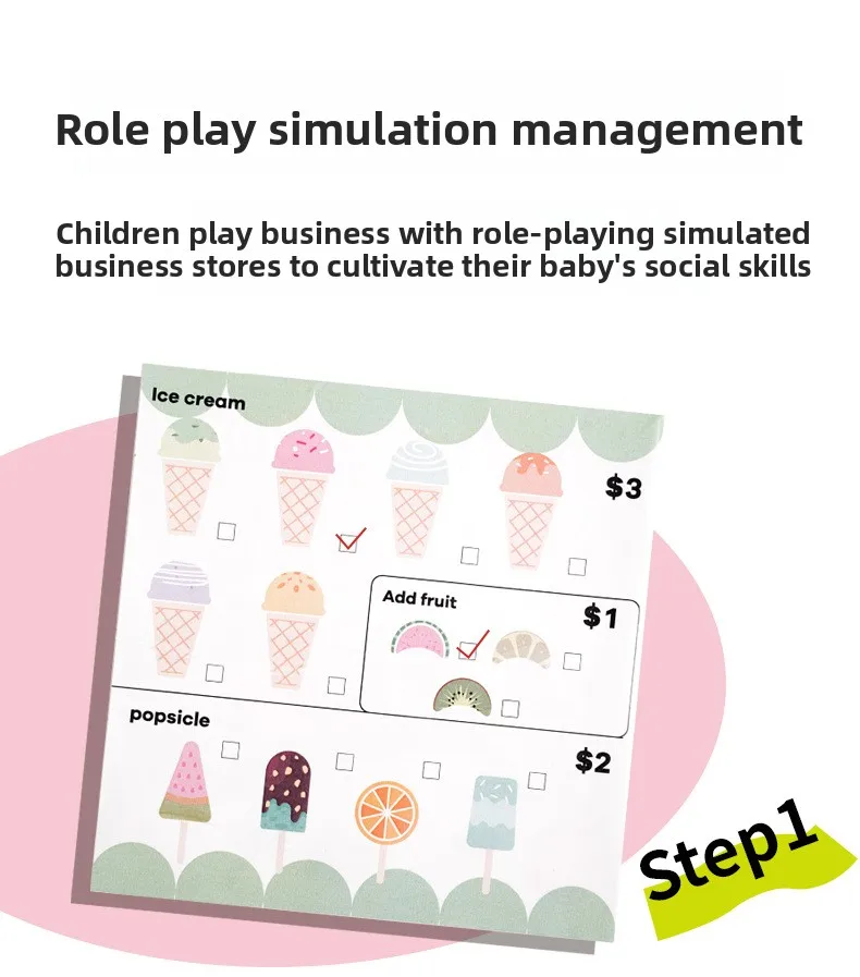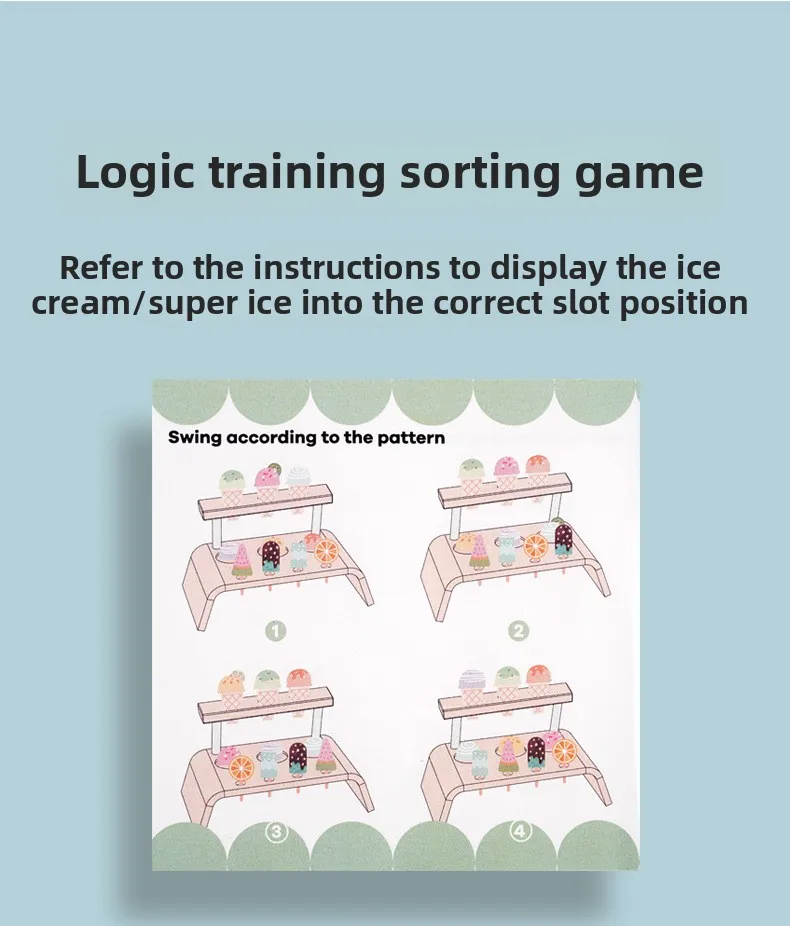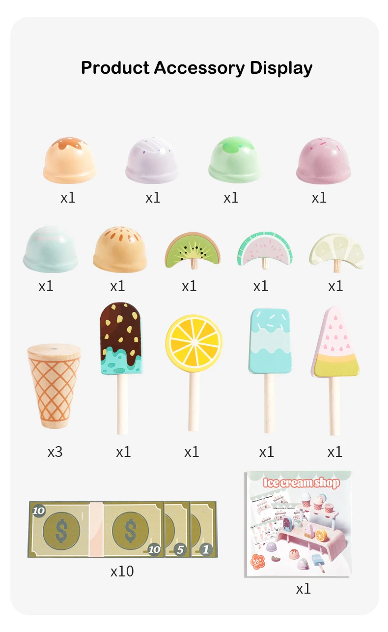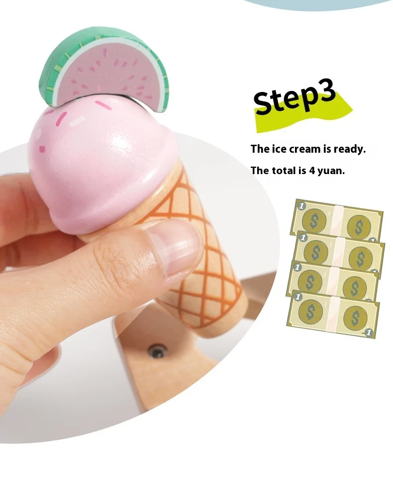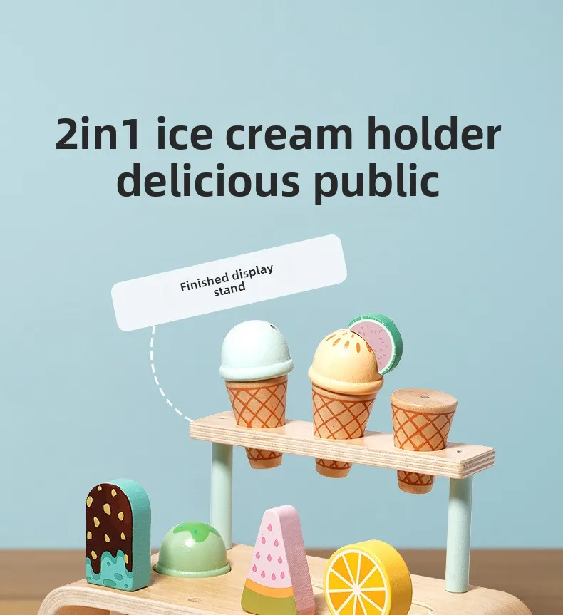 Skräddarsydda Montessori-leksaker i trä, leksaksgrannisglass på pinne, efterapningsspel med mat, kökstillbehör, trästånd för glass för barn