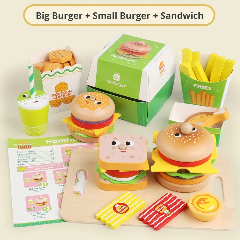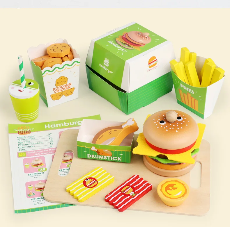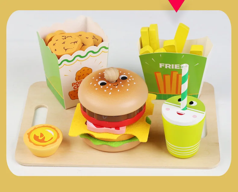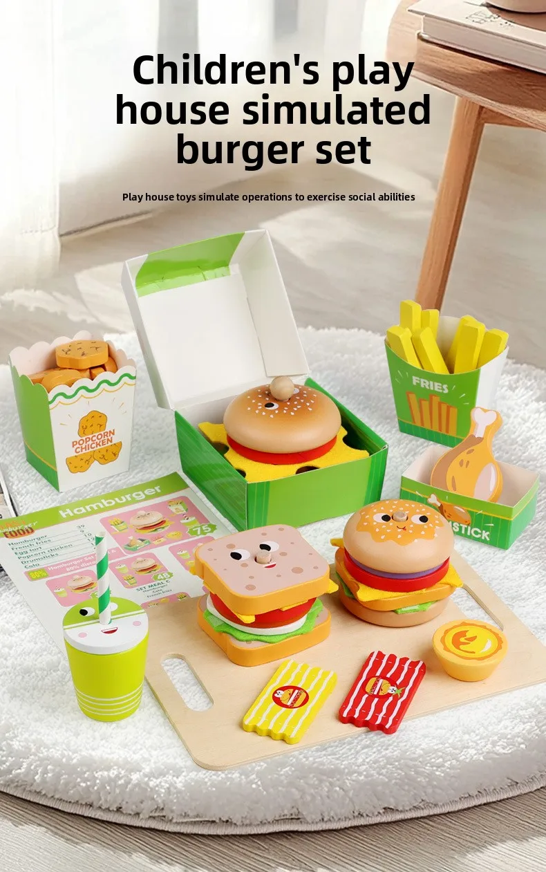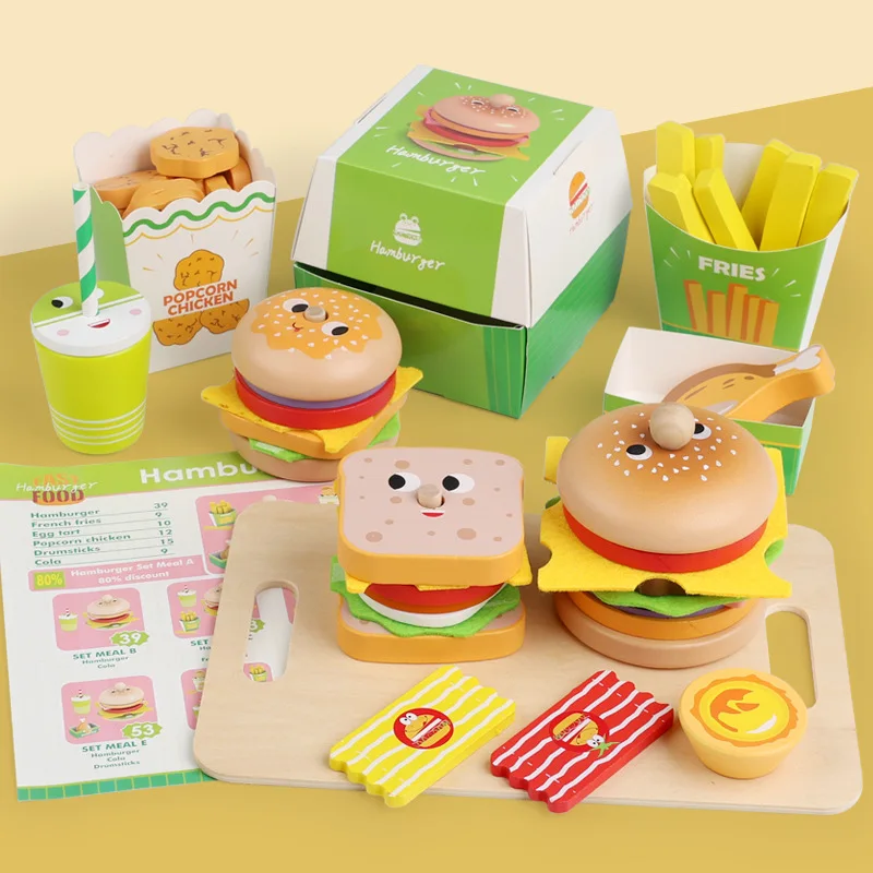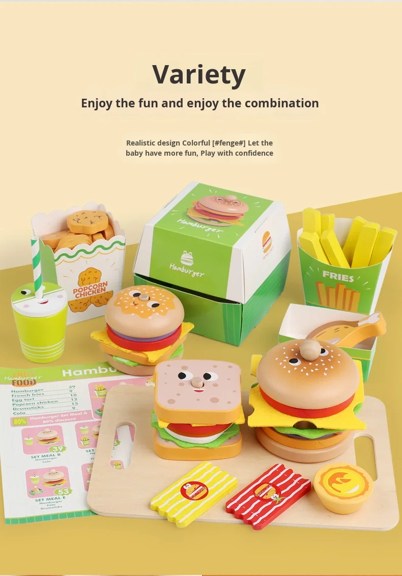 Lekmatset för barn Köksaccessoarer Trä simulering Hamburger Set Snabbmat Pommes Frites Dryck Smörgås Set Träleksaker